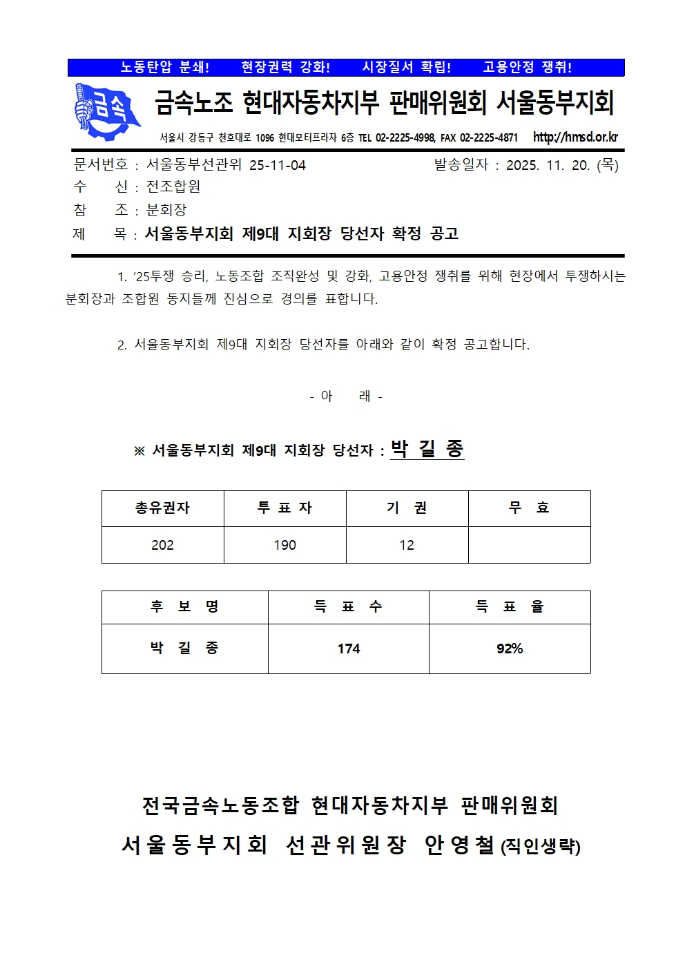 서울동부지회 제9대 지회장 당선자 확정 공고