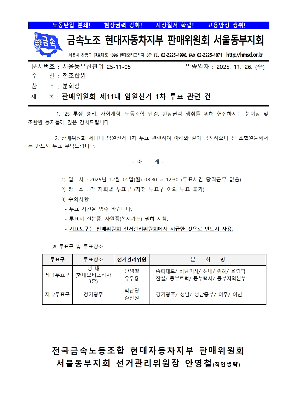 판매위원회 제11대 임원선거 1차 투표 관련 건