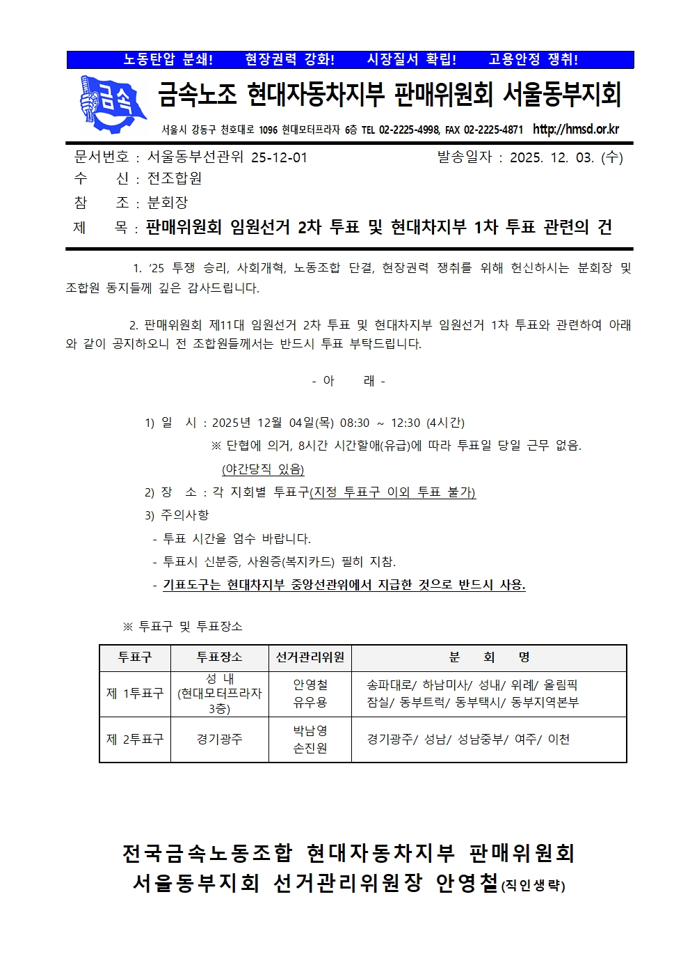 판매위원회 임원선거 2차 투표 및 현대차지부 1차 투표 관련의 건