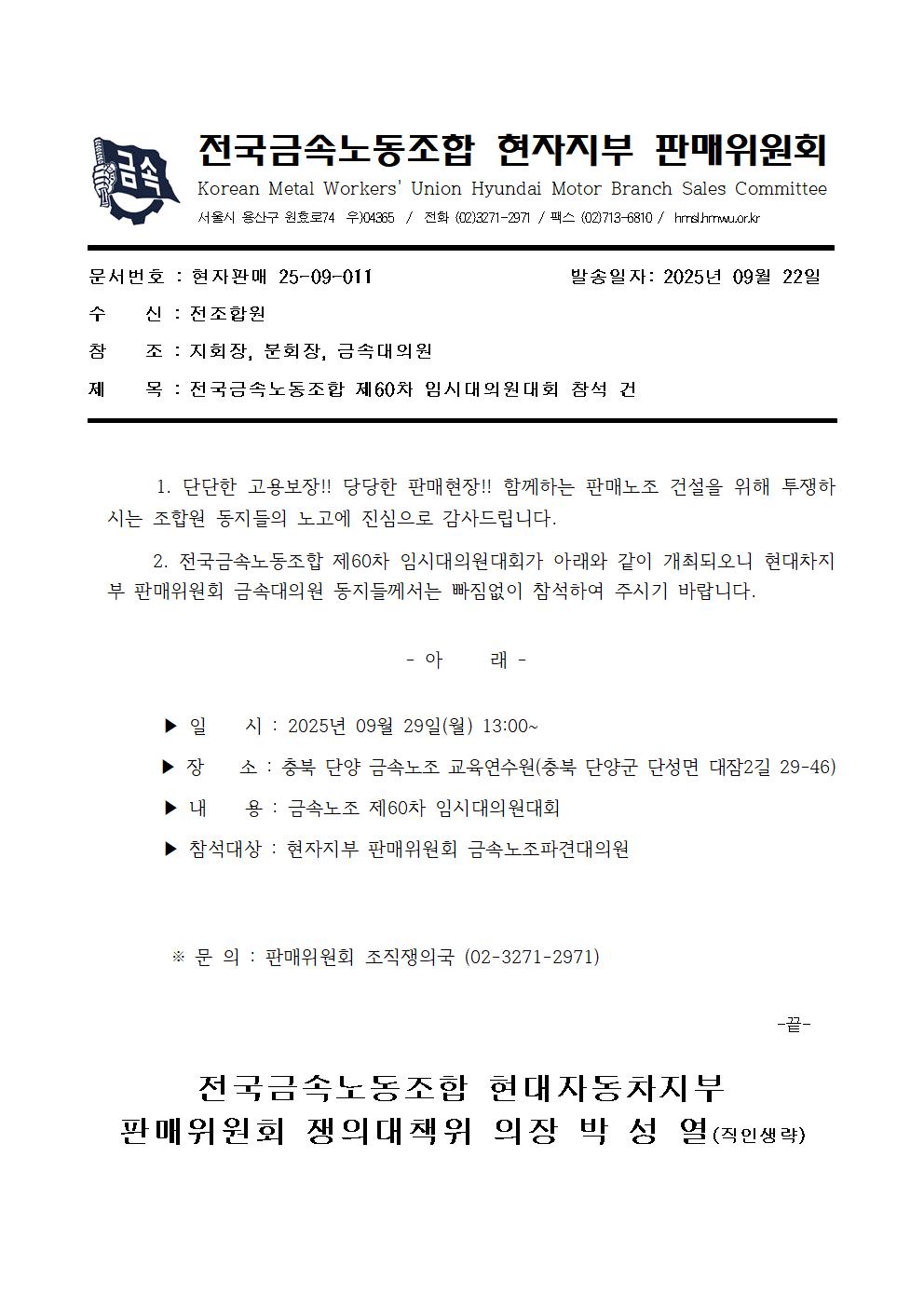 [공문]전국금속노동조합 제60차 임시대의원대회 참석 건