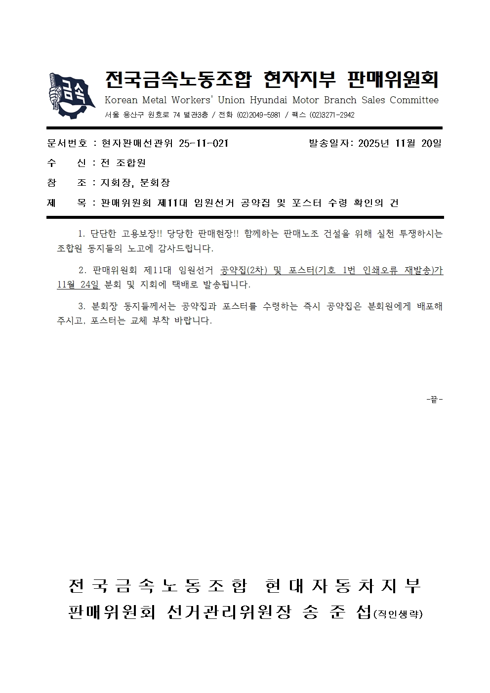 [선관위 공문] 판매위원회 제11대 임원선거 공약집 및 포스터 수령 확인의 건