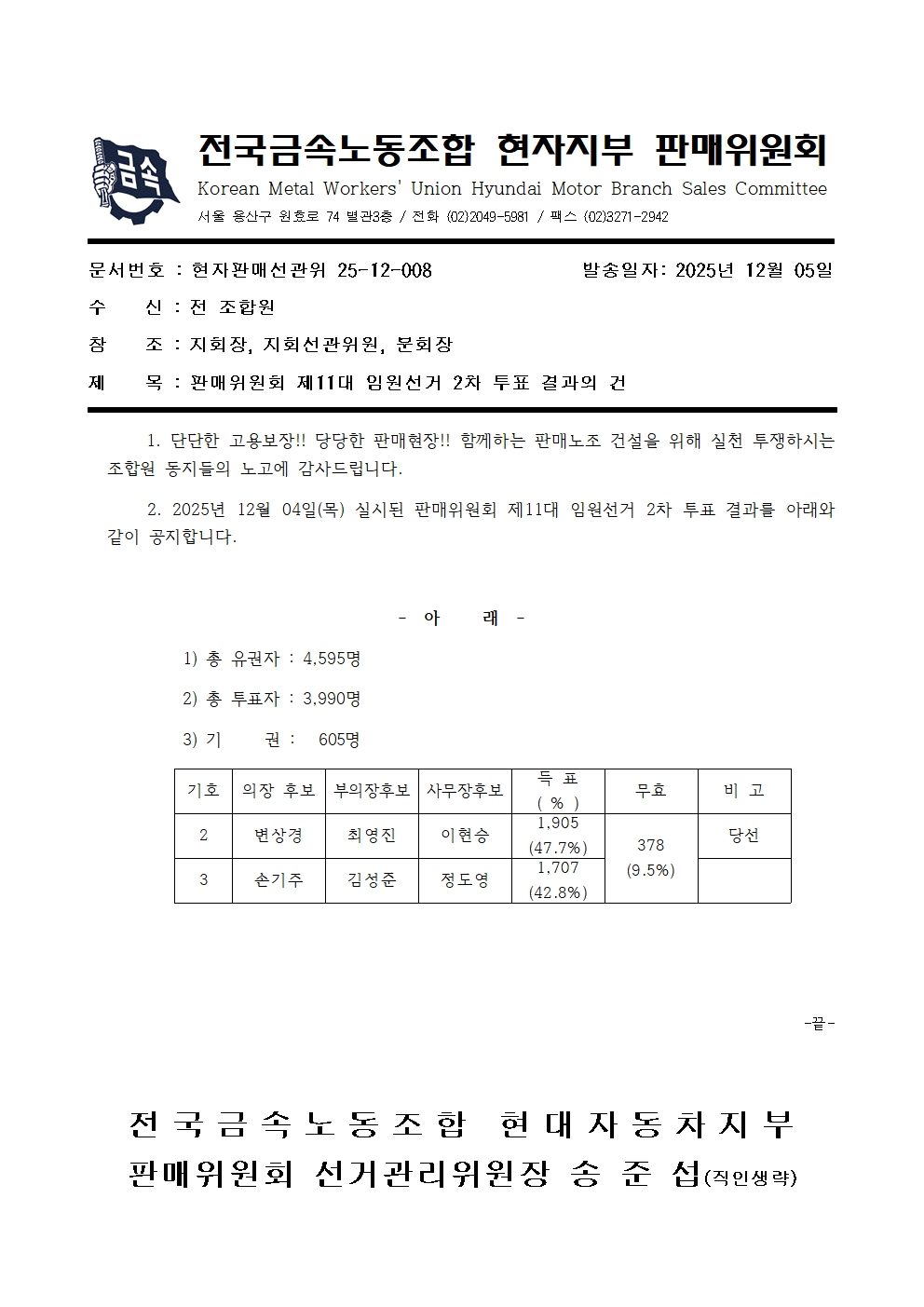 [선관위 공문] 판매위원회 제11대 임원선거 2차 투표 결과의 건