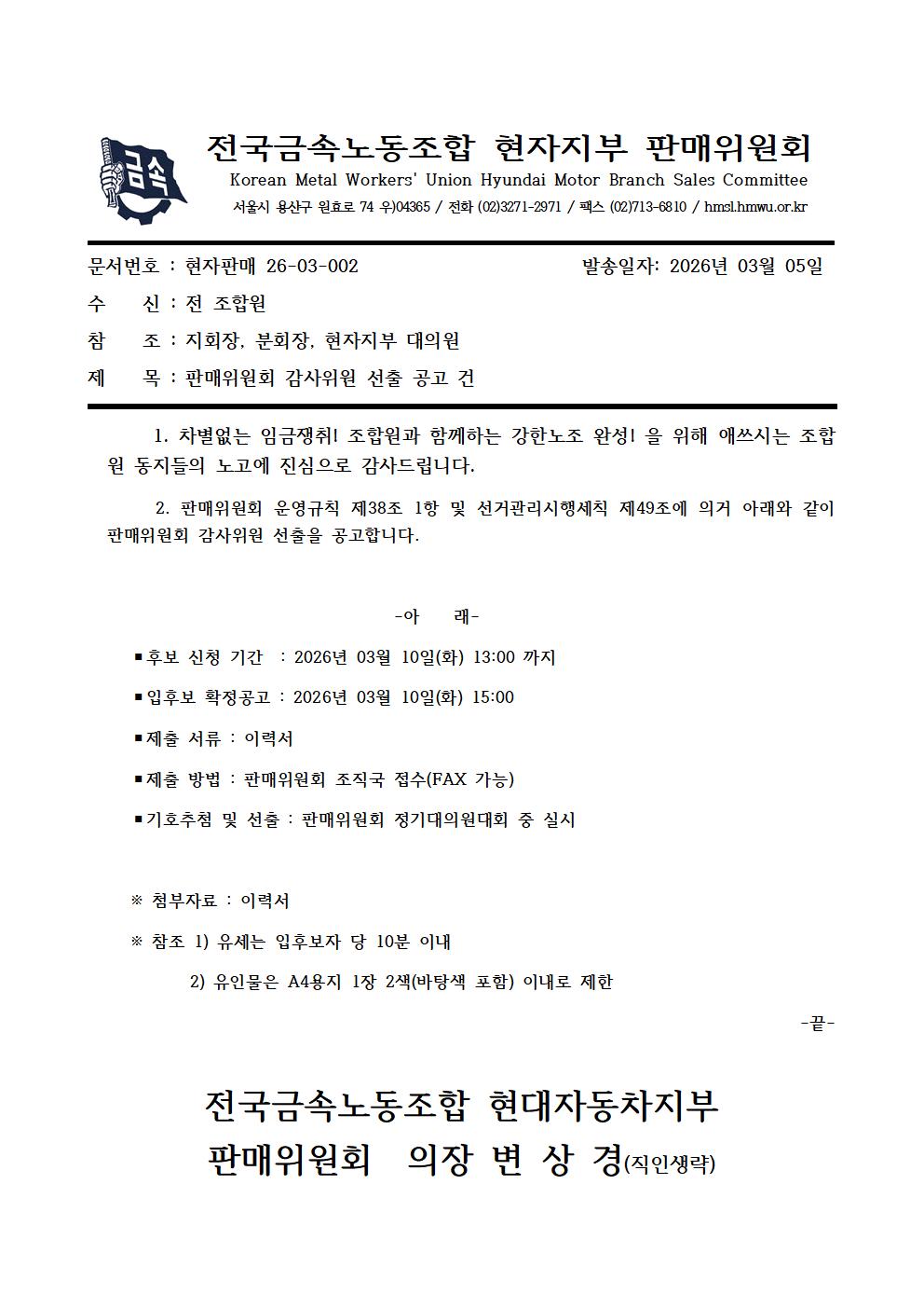 [공문] 판매위원회 감사위원 선출 공고의 건