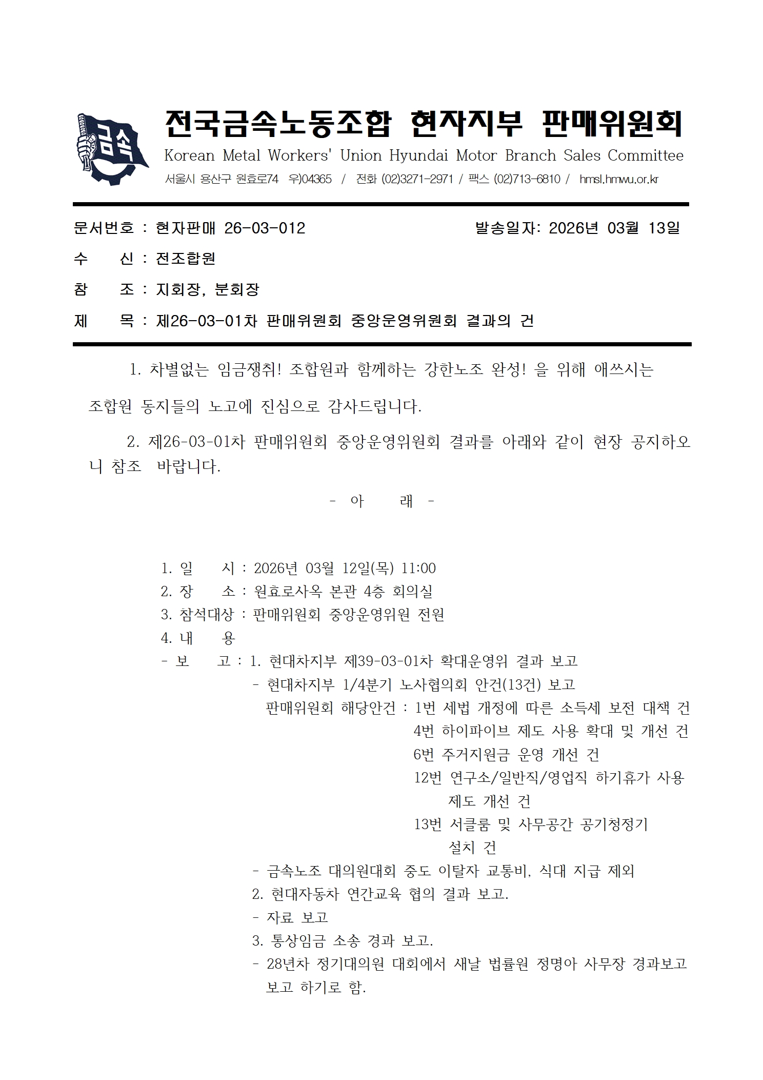 제26-03-01차 판매위원회 중앙운영위원회 결과의 건