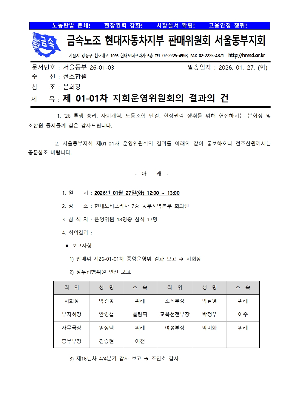 제 01-01차 지회운영위원회의 결과의 건