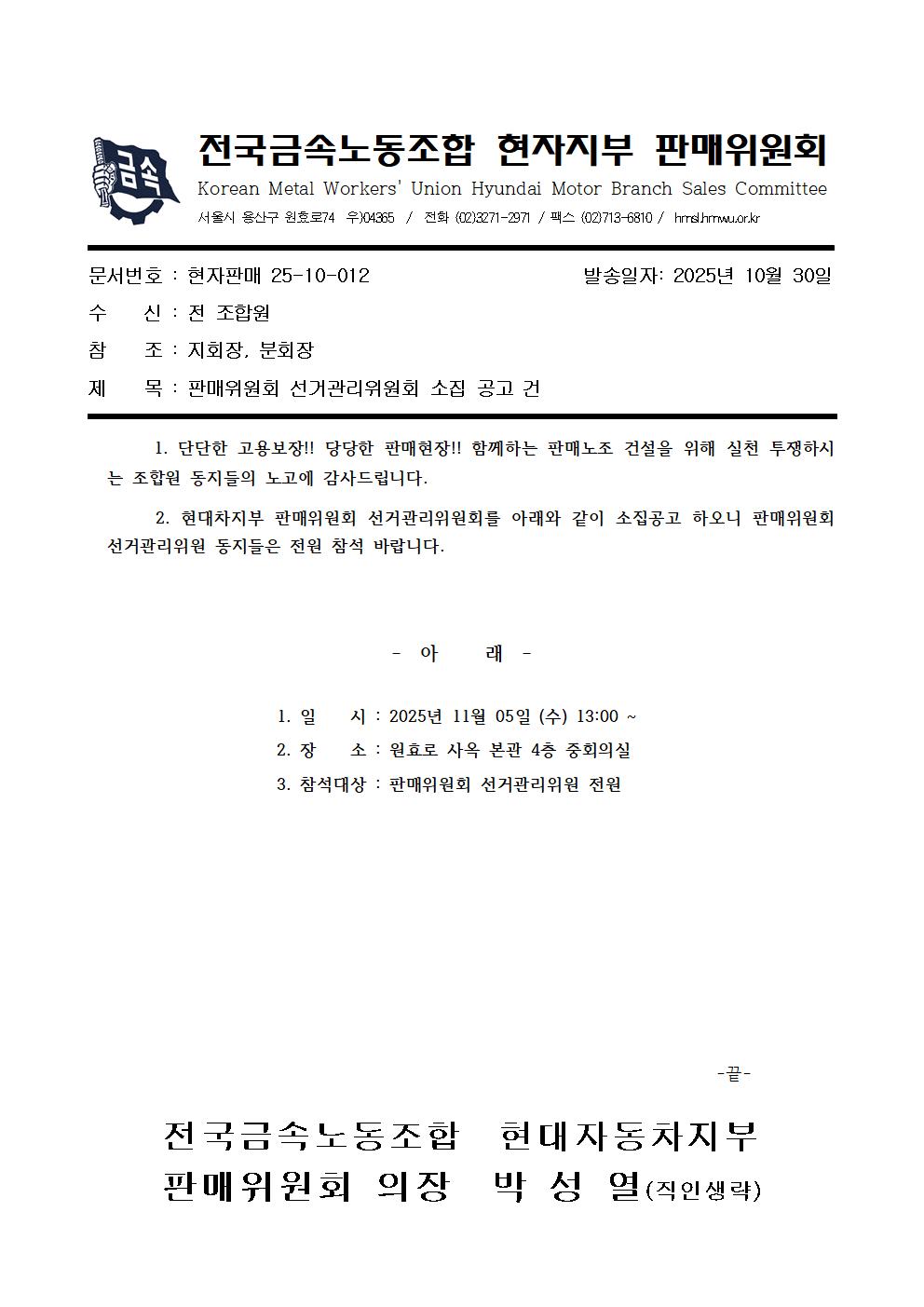 [공문]판매위원회 제25-10-01차 중앙쟁의대책위원회 결과 건