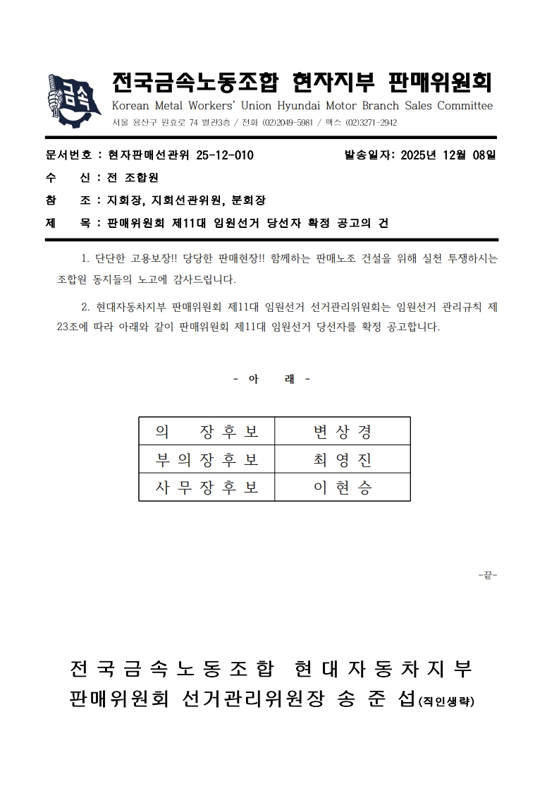 [선관위 공문] 판매위원회 제11대 임원선거 당선자 확정 공고의 건