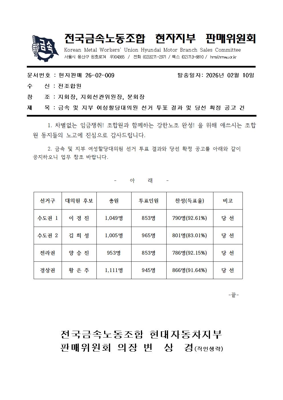 [공문]금속 및 지부 여성할당대의원 선거투표 결과 및 당선 확정 공고 건