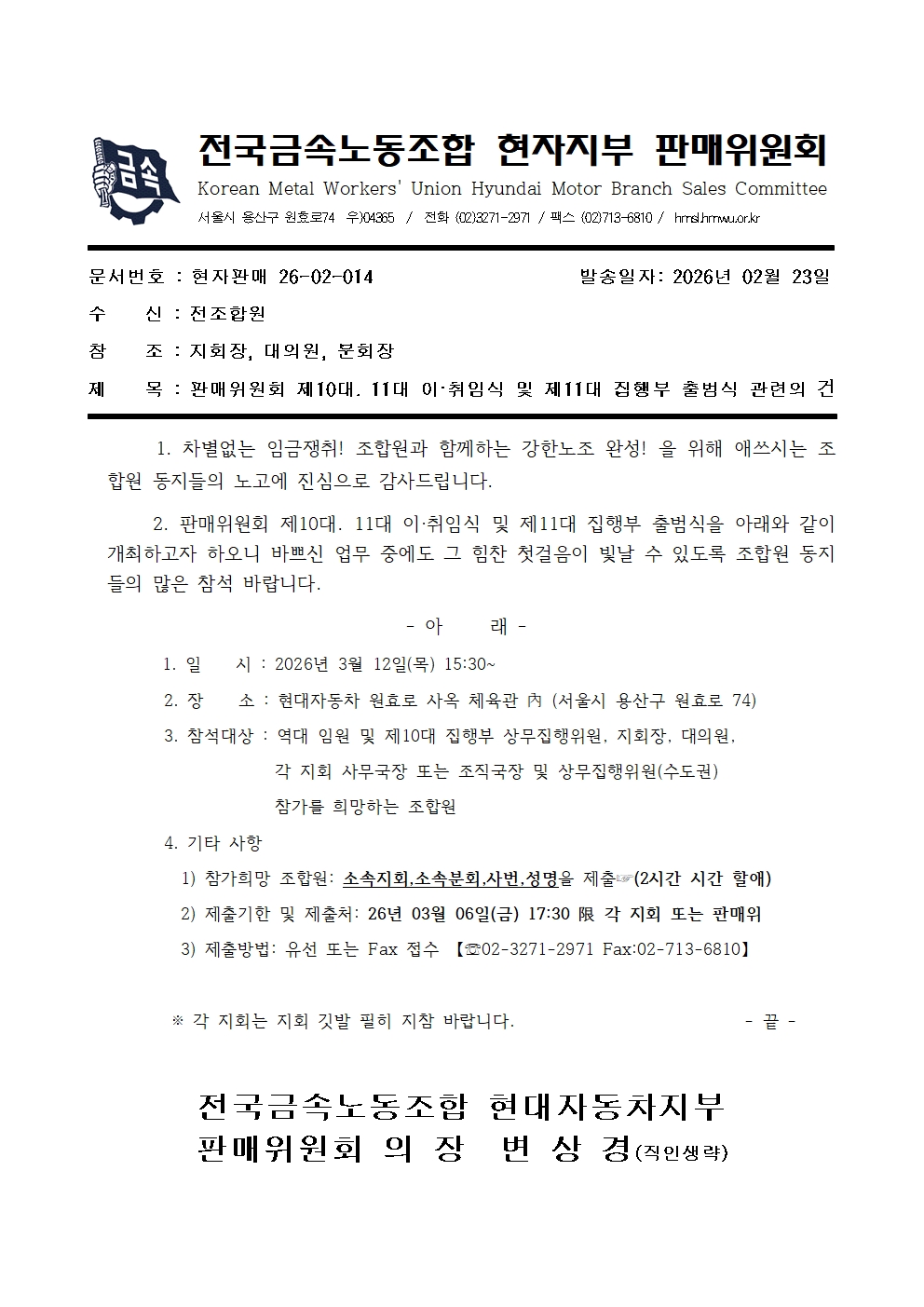 [공문] 판매위원회 제10대, 11대 이,취침식 및 제11대 집행부 출범식 관련의 건