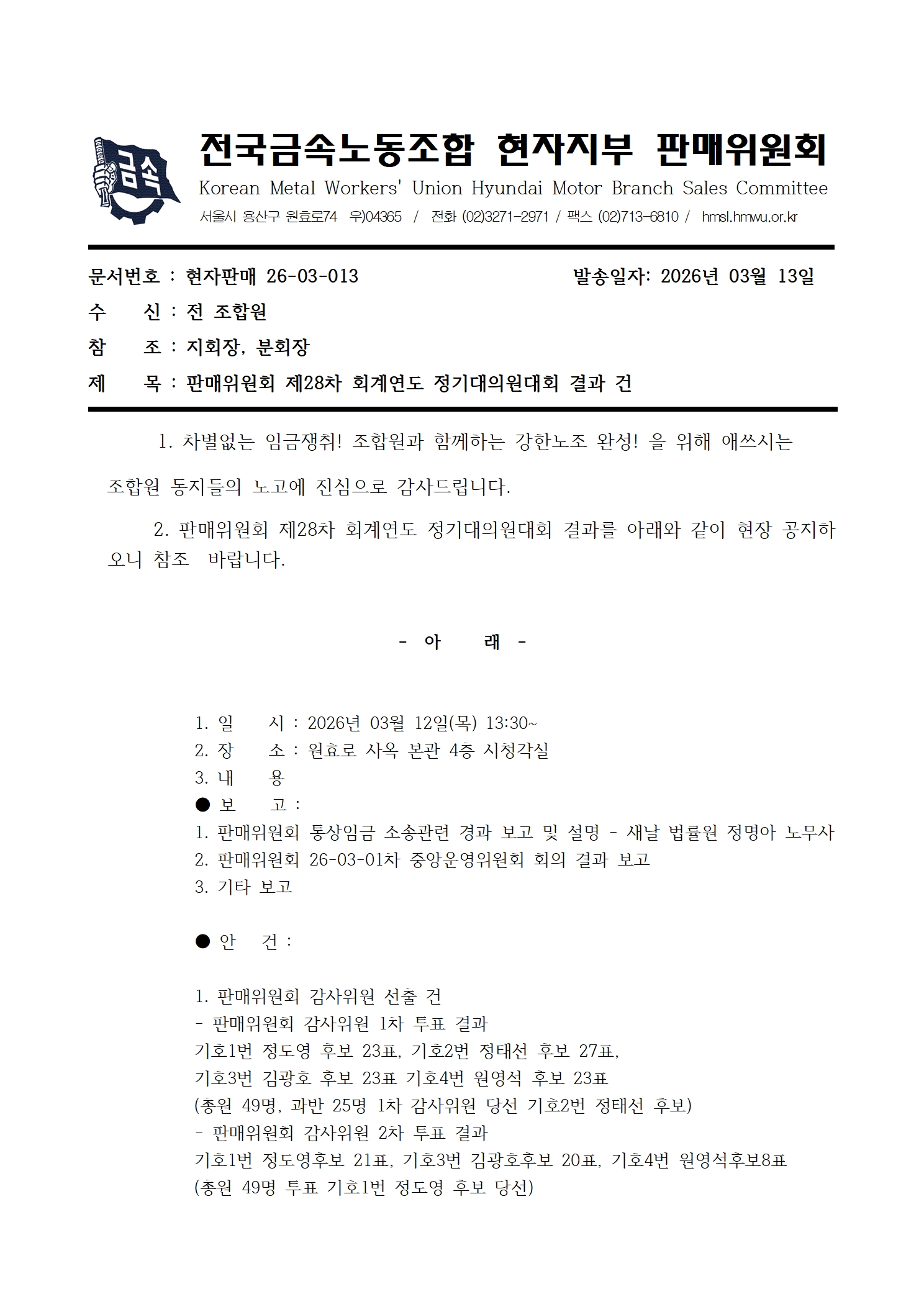 판매위원회 제28차 회계연도 정기대의원대회 결과 건